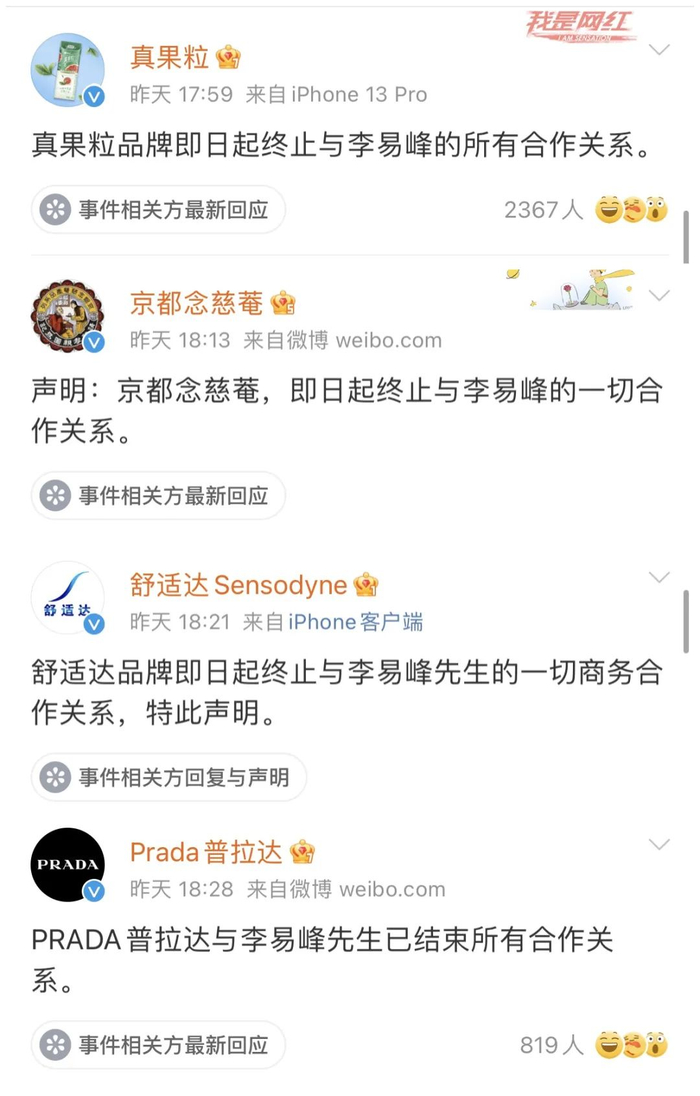 事件发生后,品牌商家迅速与李易峰解除合作关系。