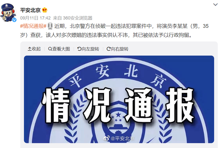 9月11日,@平安北京通报,近期,北京警方在侦破一起违法犯罪案件中,将演员李某某(男,35岁)查获,该人对多次嫖娼的违法事实供认不讳,其已被依法予以行政拘留。据央视记者通过权威渠道了解到,李某某为李易峰。