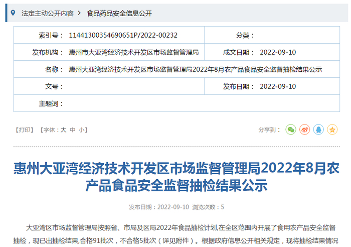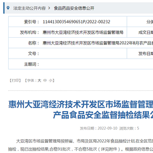 惠州大亚湾经济技术开发区市场监督管理局2022年8月农产品食品安全监督抽检结果公示