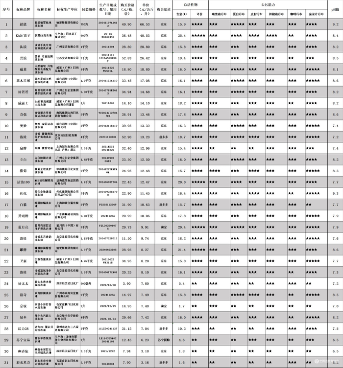 据了解,本次比较试验共购买洗衣液样品31款,样品涉及29个品牌,除“花王抗菌EX洗衣液”样品标注产地为日本外,其它均为中国制造——既包括花王、立白、蓝月亮、浪奇、奥妙等已为人熟悉的知名品牌,还有超能、洛娃、洁劲100MES等品牌。