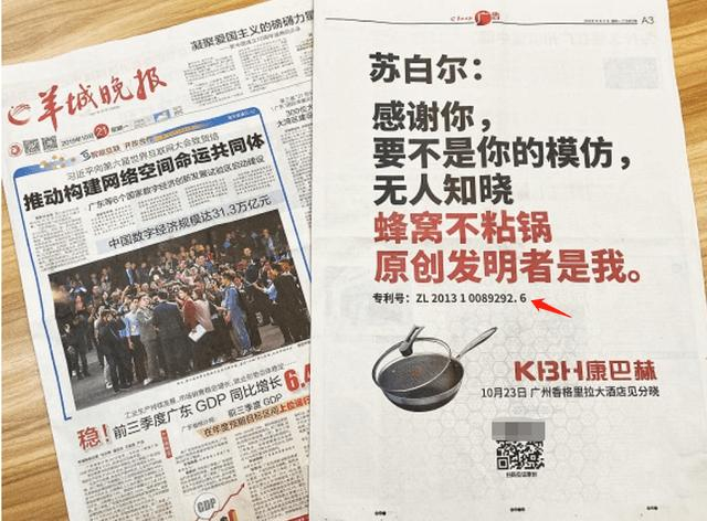 2019年10月21日的《羊城晚报》上,康巴赫重金买下整个版面向苏泊尔喊话:“苏白(泊)尔,感谢你,要不是你的模仿,无人知晓蜂窝不粘锅原创发明者是我”。而后召开了新闻发布会,直言苏泊尔盗用专利技术。