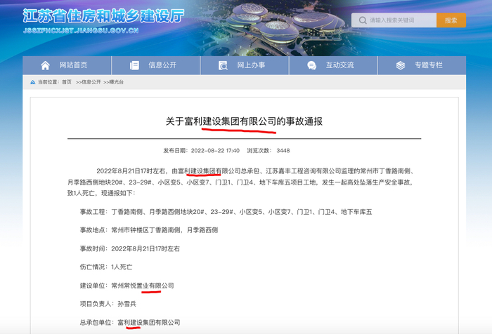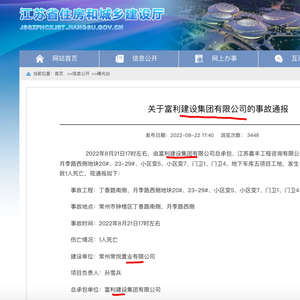 保利常州常悦置业建设项目事故死1人 总包富利建设被通报并停止在江苏揽新业务