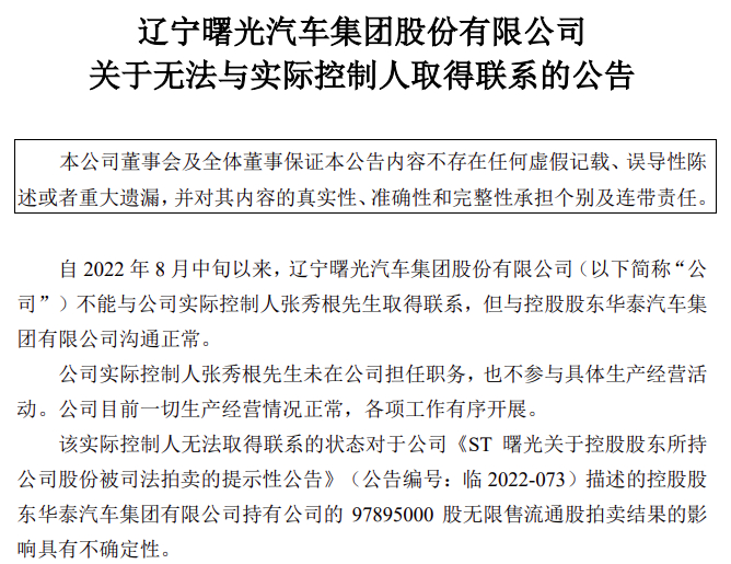 但在当日晚间,ST曙光公告称,自8月中旬以来,公司不能与公司实际控制人张秀根取得联系,但与控股股东华泰汽车集团有限公司沟通正常。