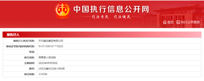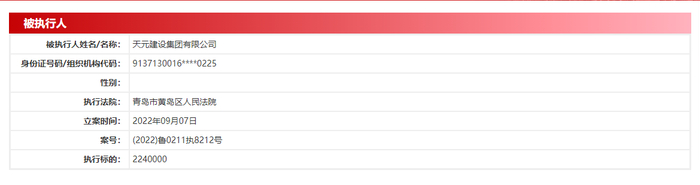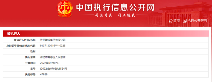 9月7日,天元建设集团有限公司被潍坊市寒亭区人民法院(案号:(2022)鲁0703执1564号)、青岛市黄岛区人民法院(案号:(2022)鲁0211执8212号)、胶州市人民法院(案号:(2022)鲁0281执4333号)列为被执行人。