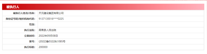 在9月8日当天,该公司就相继被天津市滨海新区人民法院(案号:(2022)津0116执19783号)、高青县人民法院(案号:(2022)鲁0322执1085号)(案号:(2022)鲁0322执1086号)、东营经济技术开发区人民法院(案号:(2022)鲁0591执1777号)列为被执行人。