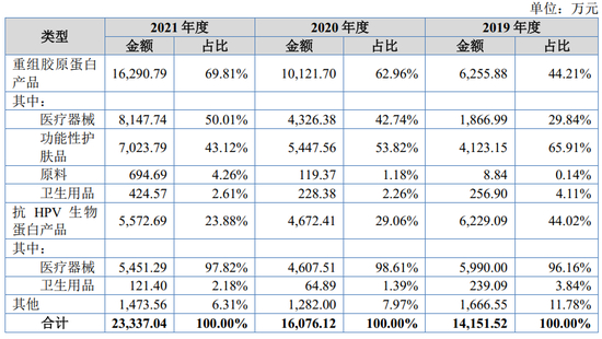 招股书显示,公司主营业务为以重组胶原蛋白产品和抗HPV生物蛋白产品为核心的各类医疗器械、功能性护肤品的研发、生产及销售。公司主要产品重组Ⅲ型人源化胶原蛋白冻干纤维作为三类医疗器械在2021年6月获药监局批准上市,主要用途是“用于面部真皮组织填充以纠正额部动力性皱纹(包括眉间纹、额头纹和鱼尾纹)”,也就是胶原水光针,商品名为薇旖美——公司称,这也是国内唯一获批的可注射重组人源化胶原蛋白产品。公司其他重组胶原蛋白产品还包括属于二类医疗器械的重组人源胶原蛋白阴道敷料、医用重组人源胶原蛋白功能敷料、胶原蛋白原液及面膜等,2019年至2021年,公司重组胶原蛋白相关产品的收入分别为6255.88万元、1.01亿元与1.63亿元,年复合增长率达到37.58%。