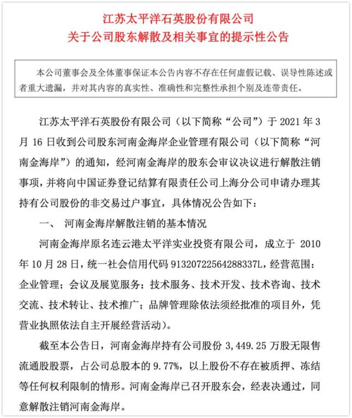 2021年3月16日,石英股份发布公告称,经金海岸公司股东会审议决议,对金海岸公司进行解散注销事项,并将金海岸公司持有的石英股份股票按5名自然人股东的持股比例进行了分配,分配的方式是股票非交易过户。