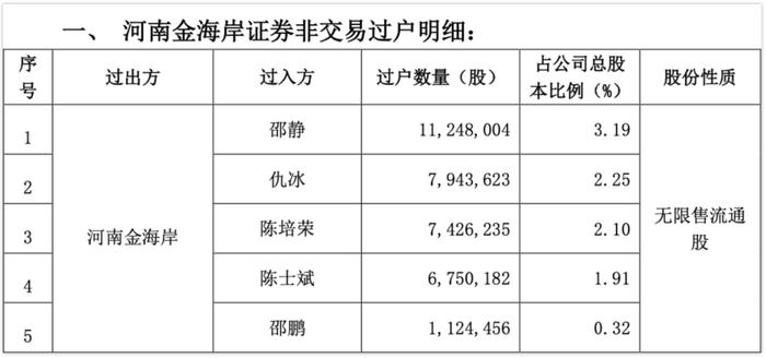 回溯可知,石英股份曾在2021年3月22日晚披露公告称,公司股东河南金海岸企业管理有限公司(以下简称“金海岸公司”)将持有的公司3449.25万股无限售流通股股票(占比9.77%),通过证券非交易过户的方式登记至邵静、仇冰、陈培荣、陈士斌及邵鹏名下,相关手续已办理完毕。金海岸公司已于当日取得《中国证券登记结算有限责任公司证券过户登记确认书》。