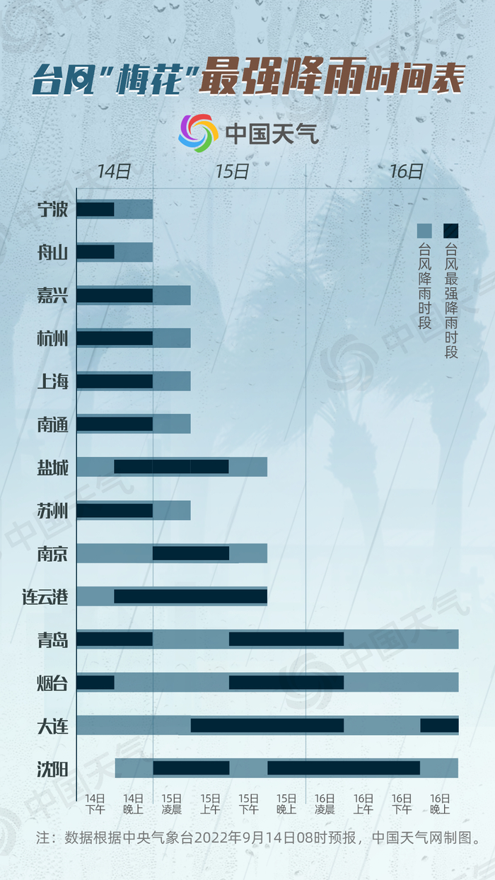 其中,浙江、上海、江苏今天就已进入最强降雨时段,山东在14日至15日,辽宁则在15日至16日。