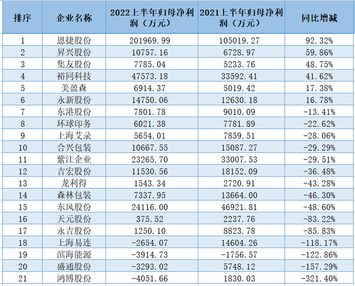 21家企业中归母净利润同比增长的公司有6家,均超过15%,分别为恩捷股份、?兴股份、集友股份、裕同科技、美盈森、永新股份。其余15家企业归母净利润同比均为下降,其中降幅超100%的企业有4家,分别为滨海能源、盛通股份、鸿博股份、上海易连。