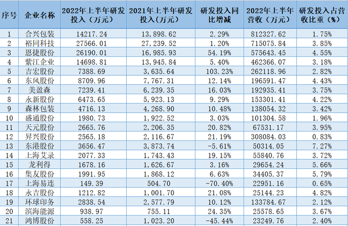21家企业中,上半年研发投入同比增长有18家,其中同比增长最多的是吉宏股份,为103%,其次是恩捷股份,为54.19%。上海易连研发投入同比下降70.4%,财报显示减少的主要原因是本期受上海疫情影响及去年同期数据含有 4 家已经剥离的印刷包装子公司。