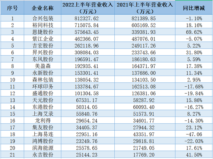 2022年7月,《印刷经理人》杂志发布了“2022中国印刷包装企业100强排行榜”(以下简称百强排行榜),其中已上市企业21家(仅限A股上市企业)。近日,多家印刷包装上市企业陆续发布了半年报,下面跟随小编一起来看百强上市企业的半年成绩单。