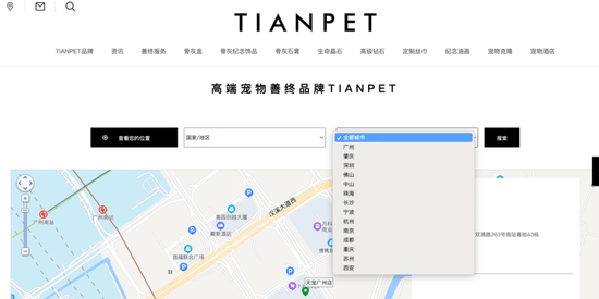 成立于2019年“TIAN PET天宠”通过连锁加盟扩张,如今已初具规模,官网显示,宠物殡葬子公司已覆盖超过14个国内一二线城市,包括广州、深圳等。