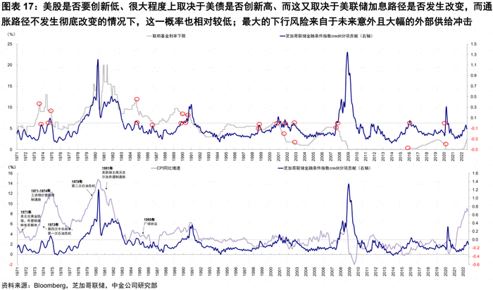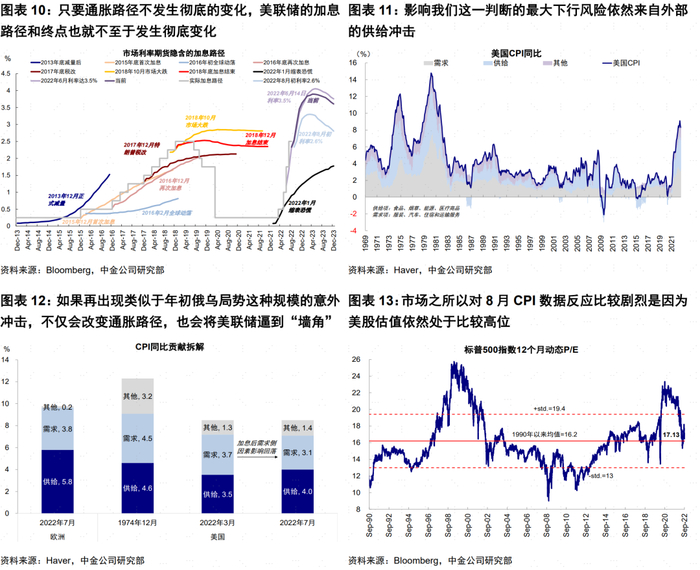 往前看,影响我们这一判断的最大下行风险依然来自外部的供给冲击。如果再度出现类似于年初俄乌局势这种规模的意外供给冲击,不仅会改变通胀路径,也会将美联储逼到“墙角”,不得以用更加强硬的紧缩立场来应对无法控制的供给侧扰动,类似于当前的欧洲和70年的美国。这叠加现在已经出现的增长放缓,会对增长和盈利造成更大压力,进而给市场造成更大冲击。但其悖论在于,既然是依然意外供给冲击,那就难以预测并放到基准假设中。