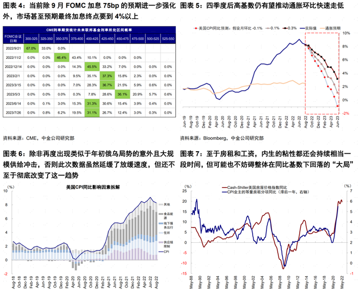 市场担心在油价趋缓不再推升表观通胀后,内生需求的粘性(如房租和工资等)可能使得通胀回落的速度比预想的慢,进而导致美联储不得不进一步加大收紧力度。因此,数据公布后,CME利率期货交易价格显示,除了9月FOMC加息75bp的预期进一步强化外,市场甚至预期最终加息终点要到4%以上。