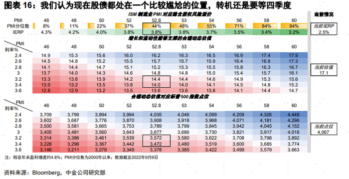 综合上文中对于通胀路径以及9月FOMC大概75bp加息的判断, 我们认为现在股债都处在一个比较尴尬的位置,转机还是要等四季度,验证通胀能否有效回落、以及美联储政策的退坡,完成政策紧缩任务与衰退压力将在四季度和明年初“擦肩而过”。在此之前,我们预计控制仓位依然是较好的选择,现金可能继续相对跑赢,而股、债、黄金和大宗商品都可能没有明显的机会甚至不排除还有下行压力,除非是已经明显跌出价值的资产,如3.5%以上的美债或者14倍以下的美股,黄金也会有压力。