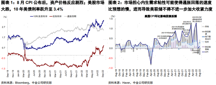 周二晚公布的美国8月CPI同比虽然继续回落(同比8.3%vs. 前值8.5%),但回落幅度低于预期(8.1%),尤其是核心CPI环比抬升幅度明显比市场想象的更强(0.6%vs. 预期的0.3%)。这再度引发市场对于美联储不得不加快紧缩的担忧,资产价格对此反应剧烈。美股市场大跌,尤其是纳斯达克指数跌幅超过5%,10年美债利率跃升至3.4%、美元指数再度逼近110、黄金同样受到重挫,典型的紧缩担忧的交易特征。