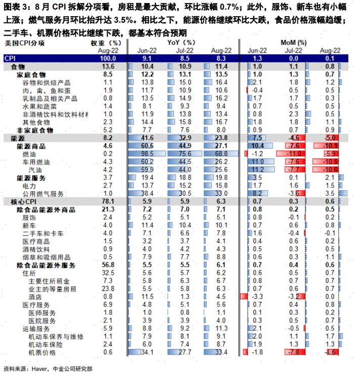 8月美国CPI数据(同比8.3%,环比0.1%;核心同比6.3%,核心环比0.6%),最让市场意外的是其高达0.6%的核心环比增速。拆解分项看,房租是最大贡献,环比涨幅0.7%,尤其是等量租金环比涨0.7%(vs. 上个月0.6%)。此外,服饰、新车也有小幅上涨;燃气服务月环比抬升达3.5%。相比之下,能源价格继续环比大跌(反应7月的国际油价下跌,存在一个月时滞);食品价格涨幅趋缓;二手车、机票价格环比继续下跌,都基本符合预期。