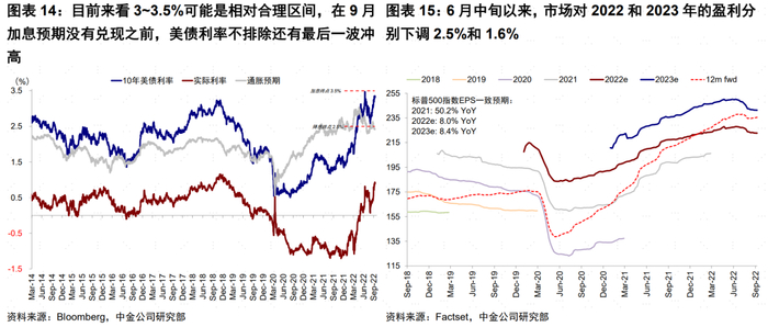 因此,只要通胀路径不发生彻底的变化,美联储的加息路径和终点也就不至于发生彻底变化,美债利率即便冲高也难以在更高的位置维持。从这个意义上看,此次9月FOMC适逢经济数据公布,相比市场已经充分计入的75bp加息,需要关注美联储对于通胀的预测、尤其是加息终点(当前为3.5~4%)和中性利率的预期(当前为2.5%)。
