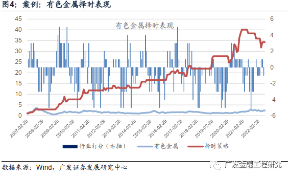 在对单个行业进行择时时,我们采取的策略为:行业选择的所有指标根据当前最新的趋势特征对该行业进行打分,具体规则为:若利多信号出现则打分加一,若利空信号出现则打分减一。若当月该行业的评分为正,则全仓买入该行业,若平分为负或为零,则清仓。我们在图表中加入行业的打分曲线,可以更直观的看出择时给出的策略选择。