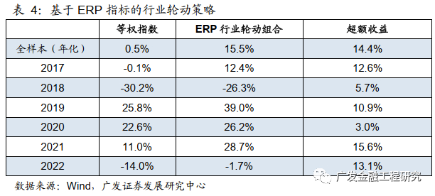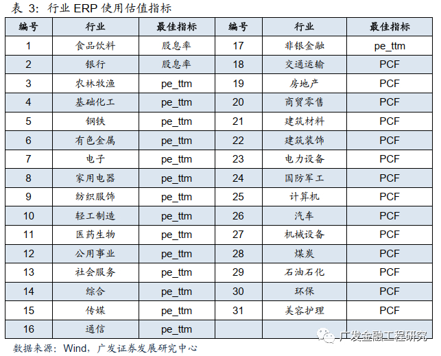 经测算,各行业择时效果较佳的ERP对应估值指标如下表所示,其中PE指标适用性最广,多数行业均采用该指标计算ERP,食品饮料和银行选择股息率,其余则采用PCF。