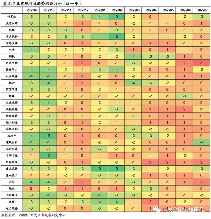 截至2022年7月底,宏观趋势策略得分最高的前五各行业分别为:医药、汽车、农林牧渔、非银金融及社会服务。
