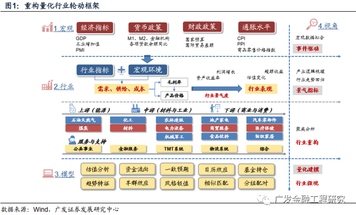 一个完善的行业轮动框架,通常涵盖对宏观变量的解读、对行业景气度的分析以及考虑个股微观特征等多个维度。前期我们分别从宏观变量、 行业指标等角度构造对行业轮动框架进行量化重构。