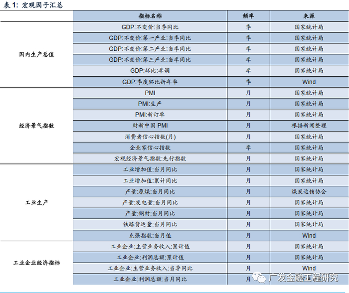 本文研究出发点是基于宏观视角,区别于事件驱动,本报告选择从趋势刻画的角度,识别有效的行业轮动信号。在宏观因子的选择上,主要选择了一些市场上投资者关注度较高的宏观因子,并要求这些宏观因子有一个比较可靠的数据来源,以及相对较高的公布频率,大部分指标至少每月公布一次数据,主要分为11大类包含:国内生产总值、经济景气指数、工业生产、工业企业指标、投资相关指标、房地产指标、零售消费、通货膨胀等,对于每个行业,也选取相关的行业指标。