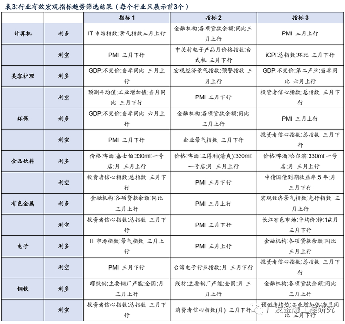 在为各行业筛选历史上对其未来收益率影响较为显著的因子事件时,我们采用其对下一期的行业轮动预测的有效性作为标准。部分行业的有效预测指标及相应趋势特征如下。