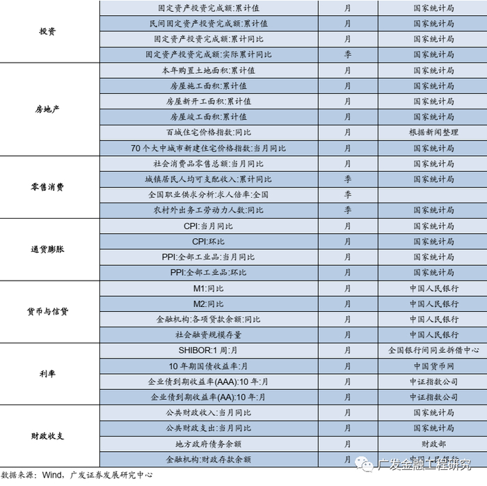 宏观环境的变化体现了经济的周期性变化及内在规律,因此它与股票市场的行业表现息息相关。为了能较好地利用宏观环境的变化信息对行业轮动提供建议,我们选取了一系列指标构成宏观因子数据库。报告从趋势刻画的角度出发来研究行业配置。在宏观因子的选择上,我们主要选择了一些市场上投资者关注度较高的宏观因子,并要求这些宏观因子有一个比较可靠的数据来源,以及一个相对较高的公布频率——至少每月公布一次数据