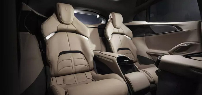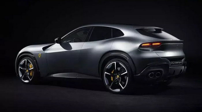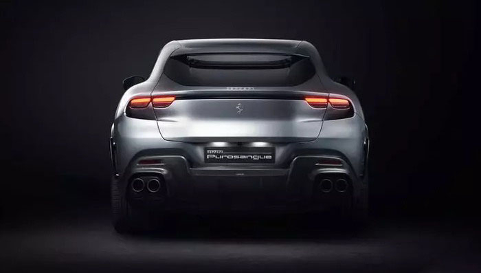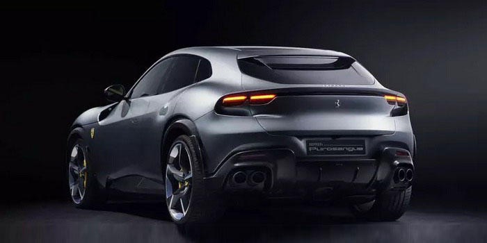 车尾部分,Purosangue车顶造型顺着圆润的曲线线条一直延伸至尾部后备厢,同时将车顶的后扰流板做成与车体相融合的设计,直接与C柱融合的样式也进一步加强了车辆的整体感。尾灯组采用了双侧共四个的矩形设计,并由一个贯穿式的镂空线条相连接,而这个镂空的设计则是与后窗玻璃下方贯通的空气桥设计,代替了传统的扰流板,并且还可以进一步增加空气动力学效果。新车后包围则采用了造型复杂的尾部扩散气装置,并同时搭配了双边共四出的排气布局。