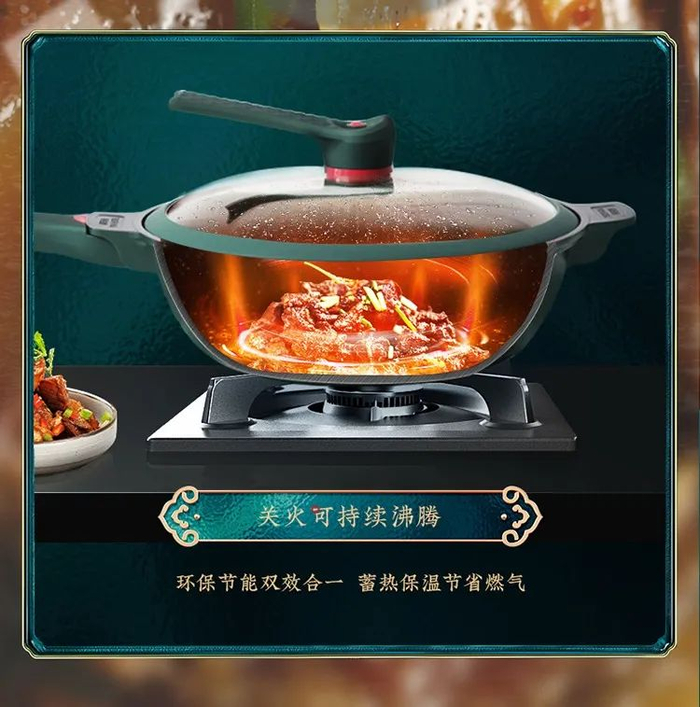 它比普通的炒锅多了微压功能,能将长时间的熬煮时间大幅缩短,秒变微压锅。