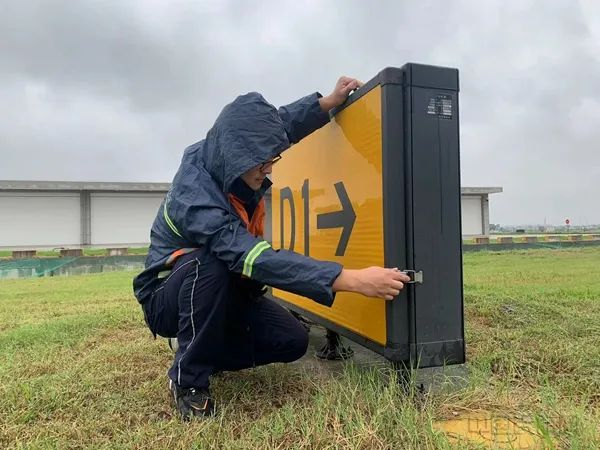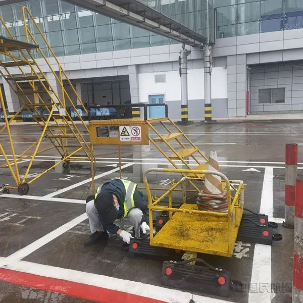 杭州机场工作人员正在检查滑行引导标记牌卡扣