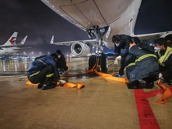 南航工程技术分公司工作人员针对台风“梅花”制定详细应急预案,依据机场实时风力等级,采取对应系留工作方案,使用绑带、绳环为飞机系好“安全带”,机坪设备、工作梯和维修工具被妥善捆绑或转移,并由现场巡场人员定期检查安全可靠性,防止给机坪建筑造成外来物损伤。