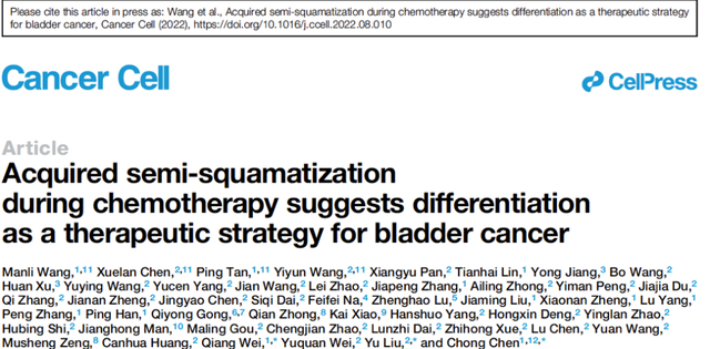 我校华西医院生物治疗国家重点实验室陈崇教授、刘玉教授团队联合泌尿外科魏强教授于2022年9月12日在Cancer Cell发表研究论文Acquired semi-squamatization during chemotherapy suggests differentiation as a therapeutic strategy for bladder cancer,发现了半鳞状分化是膀胱癌化疗耐药的一个新特征,进而提出靶向组织蛋白酶CTSH促进耐药肿瘤细胞终末分化的分化治疗策略。四川大学华西医院生物治疗国家重点实验室和泌尿外科王漫丽博士、陈雪兰博士、谭平博士、博士研究生王怡匀为文章的共同第一作者,四川大学华西医院陈崇教授、刘玉教授、魏强教授为通讯作者。该工作得到了魏于全院士的指导。四川大学黄灿华教授等参与了该研究。