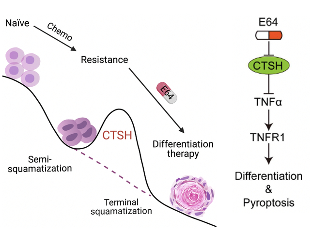 团队通过病理分析、分化标志物染色及单细胞组学、转录组、蛋白质组学等分析,发现敲除CTSH或者E64处理后,原先已经呈现一定程度的鳞状分化的MIBC细胞发生了终末鳞状分化。机制上,CTSH抑制后,肿瘤坏死因子(TNF)上调,进而通过TNF受体(TNFR1)及下游的CASPASE-8促进肿瘤细胞终末鳞状分化,并最终发生细胞焦亡。