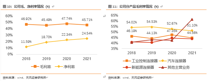 毛利率稳定保持高水平,净利率持续提高。维峰电子2018-2021年综合毛利率均在45%以上,2019年公司毛利率略有下滑主要系受宏观经济影响,2021年主要因上游铜等原材料涨价,公司成本略有上升,但总体在可接受范围内波动。公司盈利能力水平较高且保持稳定,主要系坚持高品质、差异化市场定位。深耕工控连接器市场,由于工控连接器国产化率较低,公司在国内尚无主要竞争对手;除此之外,公司锚定汽车&新能源两大高壁垒、高成长的赛道作为新产品拓展方向。同时公司通过内部生产管理,提高生产效率,净利润由2018年的0.43亿元增长至2021年的0.96亿元,CAGR=30.70%。