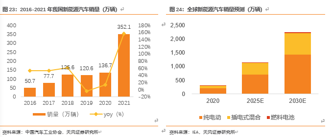 汽车是连接器最重要的下游领域之一,智能化&电动化双轮驱动高速、高压连接器市场增长。根据 Bishop & Associates 数据,汽车是重要的下游应用,2020 年占比达到 22.55%;根据 IEA 预测,2025 年全球新能源汽车销量将达到 1142.95 万辆,2030 年全球新能源汽车销量有望增至 2242.51 万辆。在汽车智能化驾驶机遇下,多传感器、域集中式趋势驱动高速连接器需求;同时新能源汽车的快速出货,驱动了高压连接器用量显著提升。
