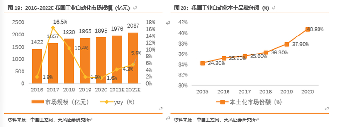 我国工业自动化虽起步较晚,但凭借持续增长的经济规模及市场容量,发展势头强劲。根据中国工控网数据显示,我国工业自动化本土品牌份额从2015年的34.30%增长至2020年的40.80%,我国工业自动化市场规模也从2016年的1,422亿元增加至2020年的1,895亿元,CAGR=7.44%,预计2022年将达到2087亿元。