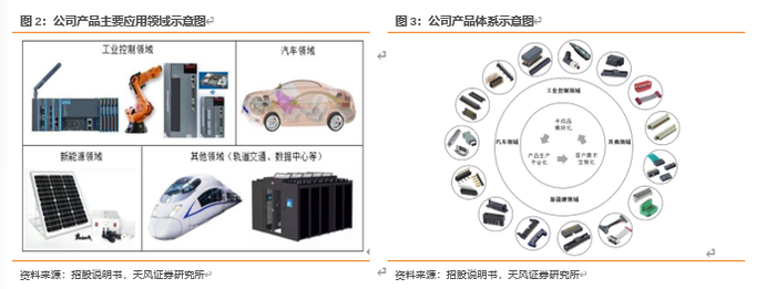 公司已形成以工业控制连接器为主体,汽车及新能源连接器为两翼的发展格局。尤其在工业控制连接器领域处于国内领先水平,工控产品种类全,是工业控制连接器国产化代表性企业。1)工业控制领域:产品可应用在伺服电机、可编程逻辑控制器(PLC)、机械手臂、工业电脑等工业控制与自动化设备。由于应用设备长期在振动和噪音环境中不间断运作,应用场景复杂多样,零部件维修或更换成本高,对工业控制连接器的可靠性及耐用性要求较高;2)汽车领域:产品可应用在新能源汽车最为核心的电池、电机和电控系统(简称 “三电系统”),以及车载媒体设备、高清影像系统等。汽车连接器需关注行驶状态下人车交互间的数据传输,连接器稳定性成为安全性能重要指标之一,同时要求汽车连接器匹配汽车厂商的高集成度、高精度 及轻量化标准,降低整车能耗;3)新能源领域:公司产品主要应用在太阳能及风能逆变系统。逆变器承载持续电流易导致元器件加速老化,对连接器的高电气及机械性能提出较高要求。