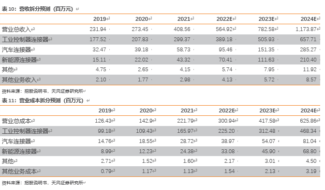 我们认为,公司产品壁垒较高,下游需求拉动市场逻辑清晰,在工控、汽车和光伏三大马车的驱动下,未来公司的业绩将有可观成长,首次覆盖,给予“买入”评级。在工控领域,工控业务受益于工业4.0的趋势,公司在工控领域持续较大投入,产品壁垒较高。公司产品贯穿决策层至执行层,包括伺服电机、可编程逻辑控制器(PLC)、机械手臂、工业电脑等工业控制与自动化设备。公司的主要客户包括汇川技术、泰科电子、台达电子等。在汽车领域,汽车业务受益于汽车智能化和电动化的趋势,公司的主要产品汽车连接器主要运用于新能源汽车最核心的“三电系统”,以及车载媒体设备、高清影像系统等,而这一品类产品国内竞争对手较少,公司有较大成长空间。在光伏领域,光伏业务受益于“碳中和”和平价入网的趋势,公司的主要产品为新能源连接器,主要运用于太阳能及风能逆变器,主要客户有阳光电源、固德威等。
