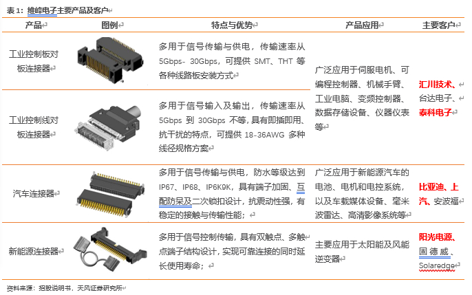 维峰电子是国内工控连接器领域龙头,1)公司自2002年成立以来专注于精密连接器的研发、设计、生产和销售,始终坚持自主创新,持续推动产品业向更高端升级,于2010年切入汽车领域、2015年进军新能源领域,目前可提供超过15,000种连接器产品。2)公司将客户需求定制化与半成品模块化、产品生产平台化相结合,经过技术积累,能够快速响应客户需求。目前客户包括汇川技术、比亚迪、泰科电子、台达电子等。