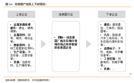 连接器是一种连接电气端子以形成电路的耦合装置,作为关键基础元器件用以实现电线、电缆、印刷电路板和电子元件之间的连接,从而传输信号或电磁能量,并保持系统与系统之间不发生信号失真和能量损失等变化。连接器行业的上游产业包括金属表面处理服务、金属材料、塑胶原料等,因此连接器公司的原材料成本在一定程度上会受到铜、锡、镍和石油等大宗商品价格的影响;连接器行业的下游应用十分广泛,主要包括通信、汽车、消费电子和工业控制等。