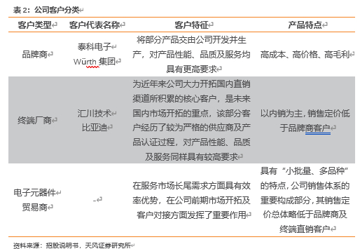 销售模式:直销模式,独立面对市场。目前公司客户既包括终端厂商、电子元器件贸易商,又包括品牌商客户。其中终端厂商主要为汇川技术、比亚迪等直接使用公司产品的客户;电子元器件贸易商主要为行业内众多专业从事电子元器件贸易的公司,根据市场需求采购后对外销售;值得一提的是品牌客户,主要包括泰科电子、Würth集团等国际知名连接器大厂,该类客户通过委托维峰设计产品并采购后贴牌对外销售,品牌客户的采购进一步印证了公司的研发能力和产品质量。