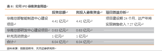 维峰电子本次IPO拟募集资金6.04亿元用于“华南总部智能制造中心建设项目”、“华南总部研发中心建设项目”和流动资金的补充。1)“华南总部智能制造中心建设项目”将进一步提高公司连接器系列产品的生产规模,解决公司产能瓶颈,该项目达产后,预计将产生年销售收入7.27亿元;2)而“华南总部研发中心建设项目”将充分改善公司研发条件,通过引进先进的软硬件设备及优秀人才,提高公司研发效率及新产品开发能力,保证公司技术先进性。