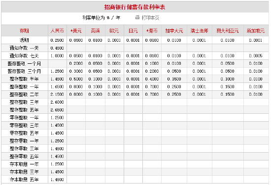 最新储蓄存款利率表显示,定期存款整存整取三个月年利率为1.25%,六个月1.45%,一年1.65%,二年2.15%,三年2.60%,五年2.65%。零存整取、整存零取、存本取息一年利率为1.25%,三年和五年为1.45%。