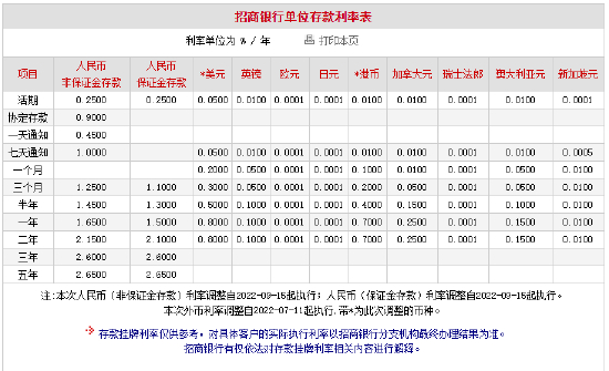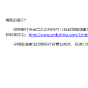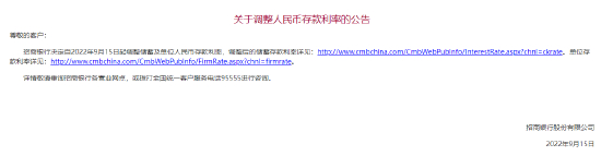 9月15日消息,招商银行今日发布公告称,自2022年9月15日起调整人民币存款利率。