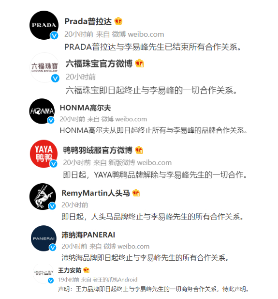 PRADA、六福珠宝、HONMA高尔夫、京都念慈?、舒适达、沛纳海也先后发文终止与李易峰的合作关系。