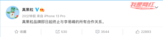 9月11日,蒙牛旗下品牌真果粒官方微博发文称:“真果粒品牌即日起终止与李易峰的所有合作关系。”