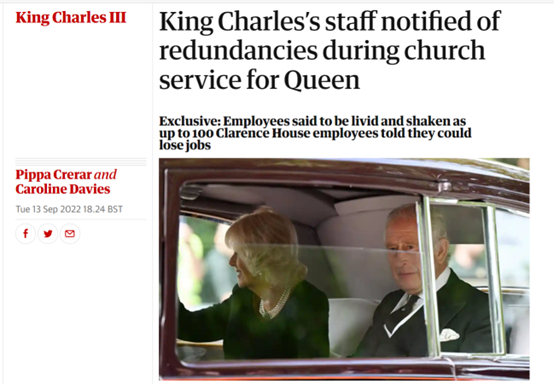《卫报》称,英国国王高级秘书在裁员的通知信中称:“我们所负责人物角色的变化也意味着我们家庭的变化……这个家庭以前所承担的、支持前威尔士王储个人利益、以前的活动和家庭运营的工作内容将不再进行,而克拉伦斯宫的家庭工作也将结束。因此,预计将不再需要主要在克拉伦斯宫从事相关工作的职位”,“我知道这是一个令人不安的消息,我想让你知道在这一点上我们可以提供支持。”
